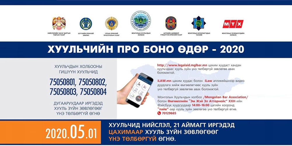 Нийслэлийн Засаг даргын Тамгын газар, Монголын Хуульчдын холбоотой хамтран иргэдийн эрх, хууль ёсны ашиг сонирхлыг хамгаалах зорилгоор “Нийслэлийн иргэдийн хууль, эрх зүйн боловсролыг дээшлүүлэх дэд хөтөлбөр”-ийн хүрээнд хууль зүйн үнэ төлбөргүй зөвлөгөө өгөх “Хуульчийн Про Боно өдөр-2020” өдөрлөгийг маргааш буюу 2020 оны тавдугаар сарын 01-ний өдөр зохион байгуулах гэж байна.