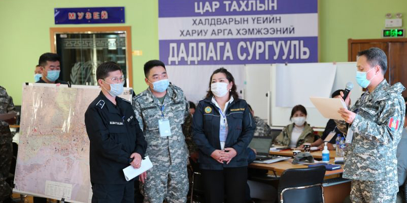 “Ковид-19″ цар тахлын үеийн харилцан ажиллагаа, хариу арга хэмжээ” дадлага сургуулийн хүрээнд Буянт-Ухаа спортын ордныг түшиглэн 300 ортой эмнэлэг, Эх, хүүхдийн нэгдсэн эмнэлэгт 100 ортой эмнэлэг, ОБЕГ-ын харьяа Давтан сургалт, сэргээн заслын төв-113 дугаар ангийг түшиглэн хээрийн эмнэлэг дэлгэснээр болзошгүй эрсдэлийн үед буюу цар тахал дэгдсэн тохиолдолд иргэний байгууламжийг ашиглах, дайчлагдан ажиллах эмч, эмнэлгийн ажилтнууд, бусад мэргэжлийн байгууллагын алба хаагчдад цар тахлын үед өөрсдийгөө хэрхэн хамгаалах, хүмүүст хэрхэн мэргэжлийн тусламж үйлчилгээ үзүүлэхэд суралцах боломжийг олгож байгаагаараа ач холбогдолтой болсон юм. Мөн Чингэлтэй дүүргийн нутаг дэвсгэрт бүхэлд нь 10 цагийн хөл хорио тогтоож, цар тахлын үеийн зохион байгуулалтын арга хэмжээний дадлага сургуулийг хийв.