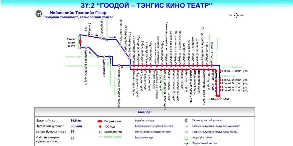 - ЗҮ:2 “Гоодой-Тэнгис кино театр” чиглэлд 1 их багтаамжийн автобус1 цаг тутамд Тэнгис кино театрын зогсоолоос;
