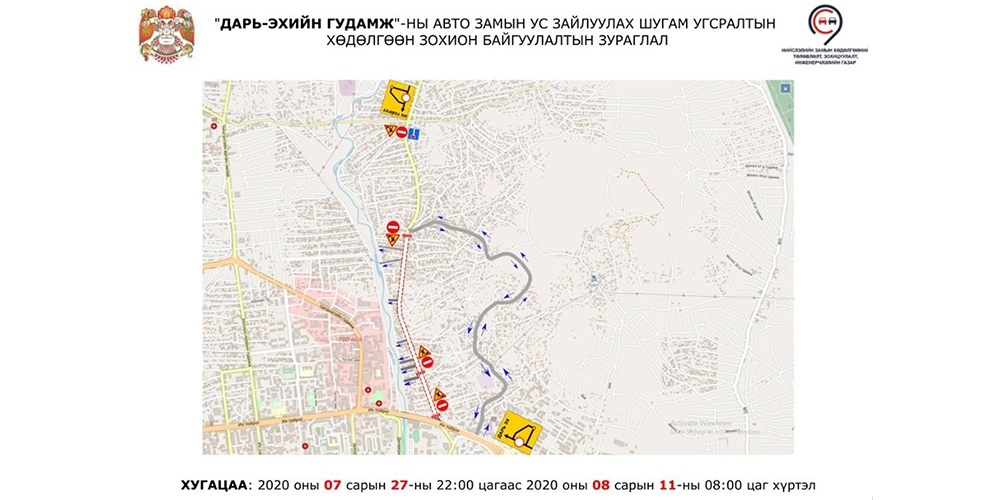 Баянзүрх дүүргийн 27 дугаар хороо, 2 дугаар хороо "Дарь-Эхийн гудамж"-ны 3.3км автозамыг шинэчлэх ажлын хүрээнд уг замыг 2020 оны 07 дугаар сарын 27-ны 22:00 цагаас эхлэн хааж засвар, шинэчлэлтийн ажил хийгдэнэ.