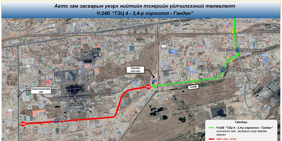 Үүнтэй холбогдуулан нийтийн тээврийн үйлчилгээний Ч:24Б “ТЭЦ 4-3, 4-р хороолол-Гандан” , Ч:73 “Зунжин худалдааны төв – ТЭЦ-4” чиглэлүүдээр зорчих иргэд та бүхэн 2020 оны 09 дүгээр сарын 08-ны өдрөөс эхлэн дараах зураглалын дагуу зорчилтоо төлөвлөнө үү.